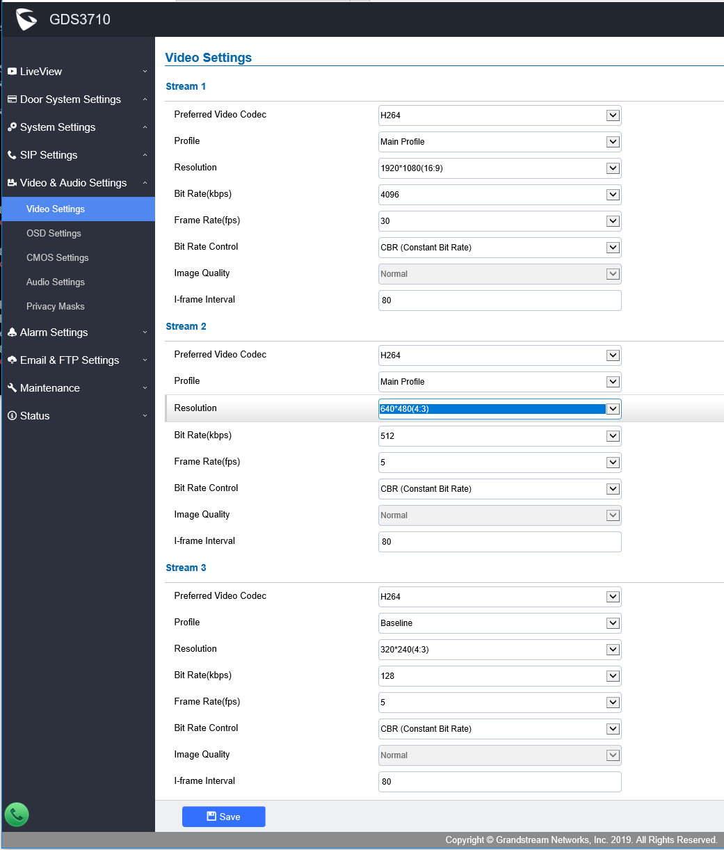Perangkat memungkinkan prasetel berbagai konfigurasi video, dengan tiga stream yang diaktifkan.