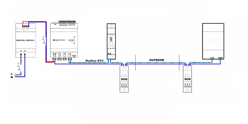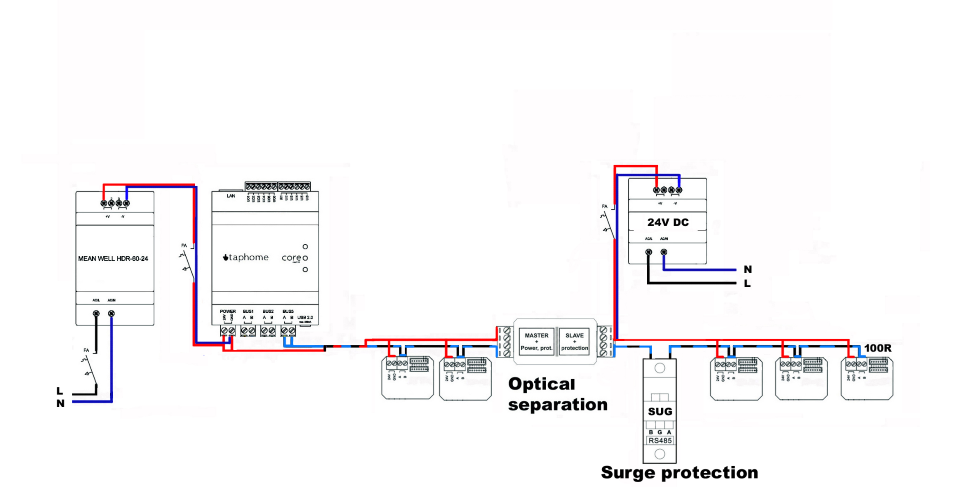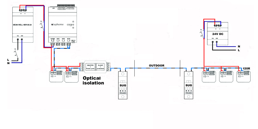 Untuk bus yang ditarik melalui eksterior, yang tidak berada di zona perlindungan sistem penangkal petir, kami merekomendasikan menggunakan pelindung lonjakan, penangkal lonjakan untuk bus Modbus juga. Saat menggunakan kabel pada diagram terlampir, tidak perlu melindungi kutub PLUS dari catu daya, karena tidak digunakan.
