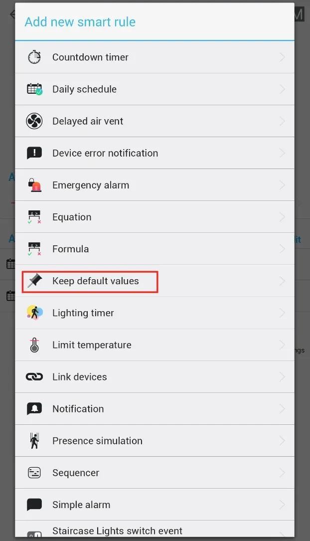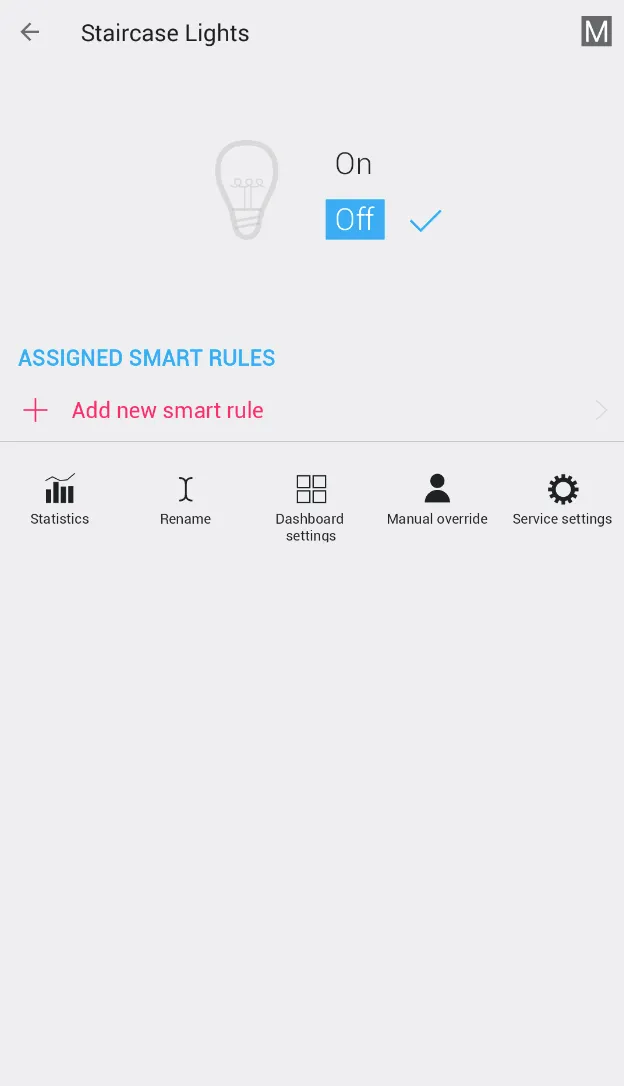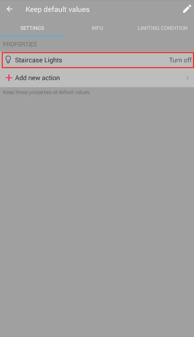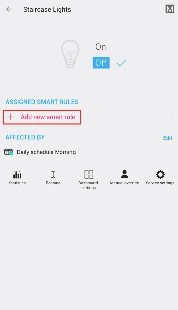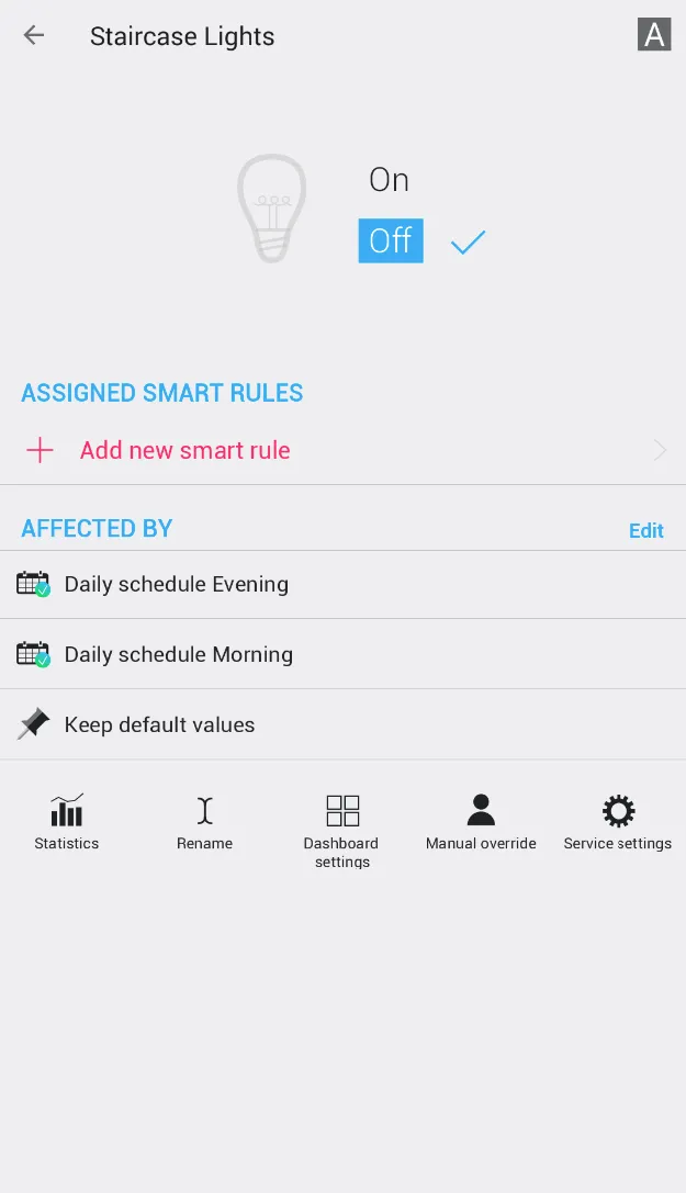 - Tambahkan Smart Rule Pertahankan nilai default dan tetapkan nilai default ke MATI. Aturan Cerdas ini akan membuat Lampu Tangga MATI jika kedua jadwal Harian tidak melakukan tindakan apa pun.