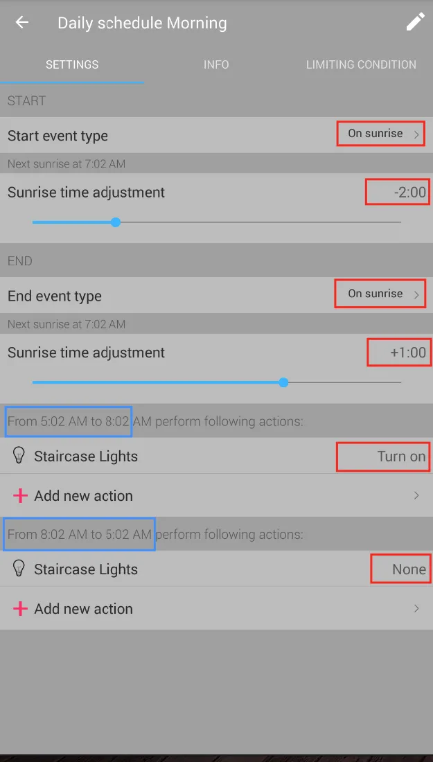 - Atur parameter seperti yang ditunjukkan. Mulai acara dari "Saat Matahari Terbit" - 2 jam, Akhiri acara "Saat Matahari Terbit" + 1 jam. Atur tindakan untuk acara ini ke "Lampu Tangga" AKTIF. Waktu yang tersisa pada hari itu tetap tanpa tindakan karena kita ingin menyisakan waktu untuk acara malam yang dikontrol oleh "Jadwal harian" terpisah yang dibuat pada langkah berikutnya.