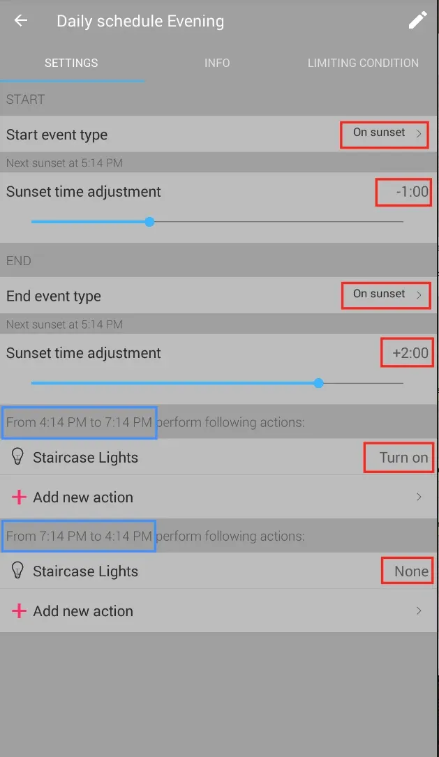 - Atur parameter seperti yang ditunjukkan. Mulai acara "Saat matahari terbenam" - 1 jam, Akhiri acara "Saat matahari terbenam" + 2 jam. Atur tindakan untuk acara ini ke "Lampu Tangga" AKTIF. Waktu yang tersisa di hari itu tetap tanpa tindakan karena kita memerlukan waktu untuk acara pagi yang dikontrol oleh pencahayaan pagi "Jadwal harian" terpisah yang dibuat di langkah sebelumnya.