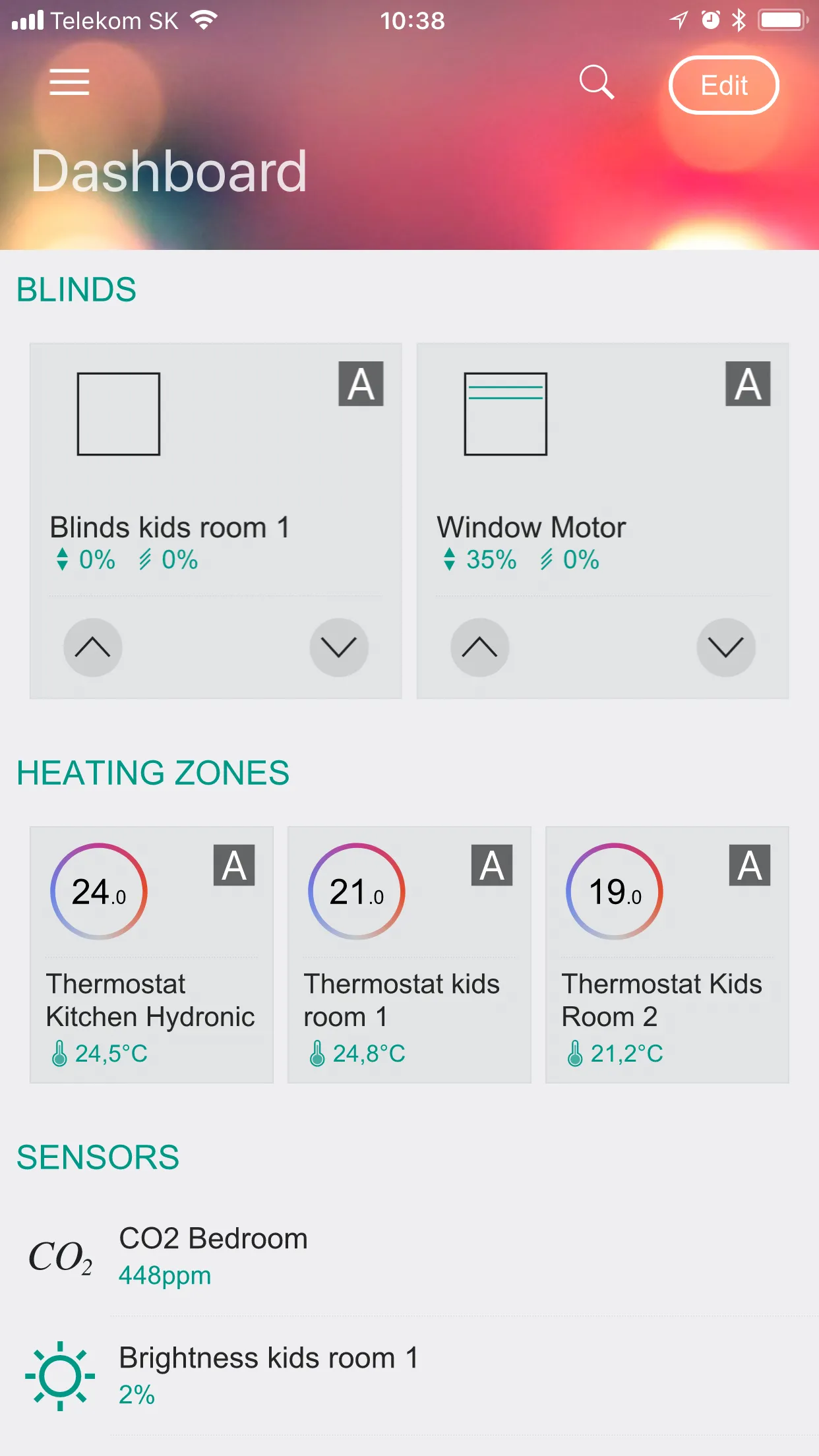 Dashboard memungkinkan Anda mengatur item favorit Anda seperti zona pemanasan / pendinginan, tirai tertentu, skenario pencahayaan, dll. Dimungkinkan untuk membuat beberapa dashboard. Ini berguna untuk proyek besar, misalnya, setiap fasad di menara kantor dapat memiliki dasbor sendiri. Dashboard disimpan di Core. Setelah menginstal ulang aplikasi, dashboard dimuat dari Core.