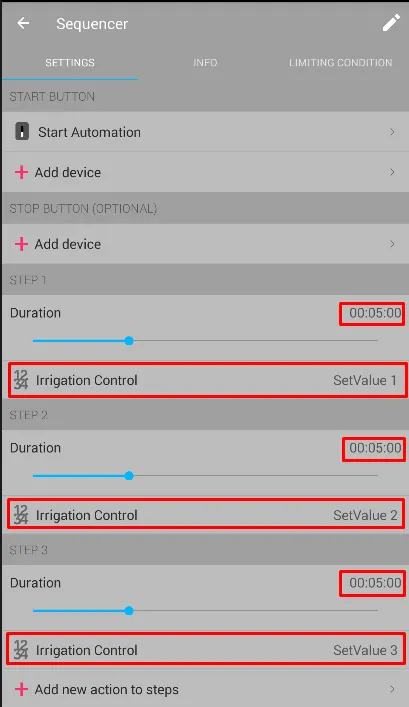 - Buat Sequencer untuk mengelola urutan (siklus) penyiraman, termasuk urutan dan durasi irigasi untuk setiap zona.