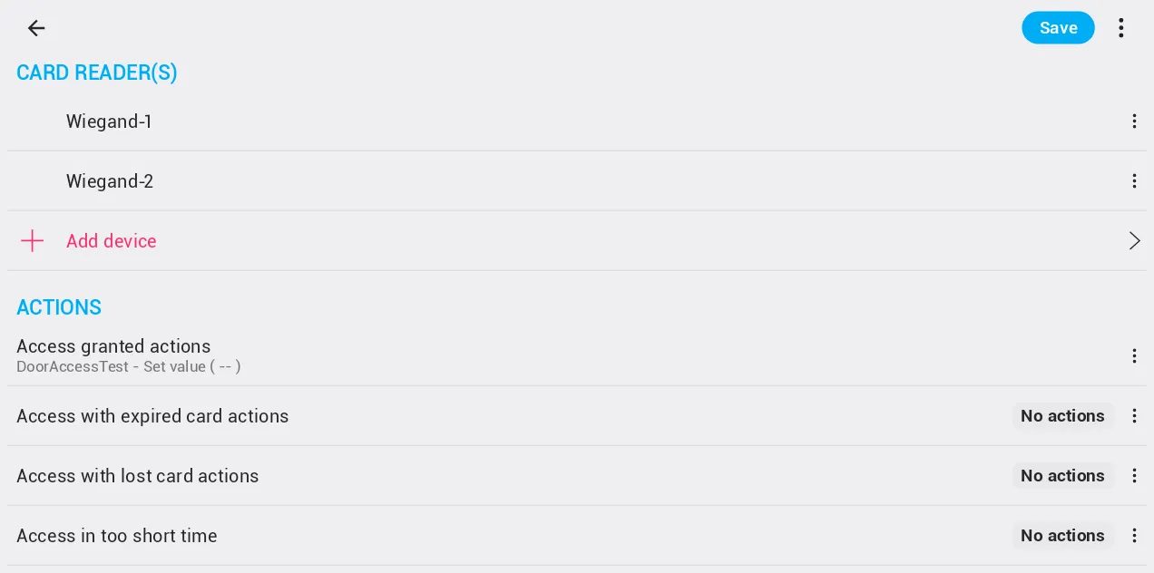 Pemicu akses dapat menentukan tindakan berbeda untuk akses yang diberikan, akses dengan kartu yang kedaluwarsa, akses dengan kartu yang hilang, dan akses dalam waktu yang terlalu singkat: