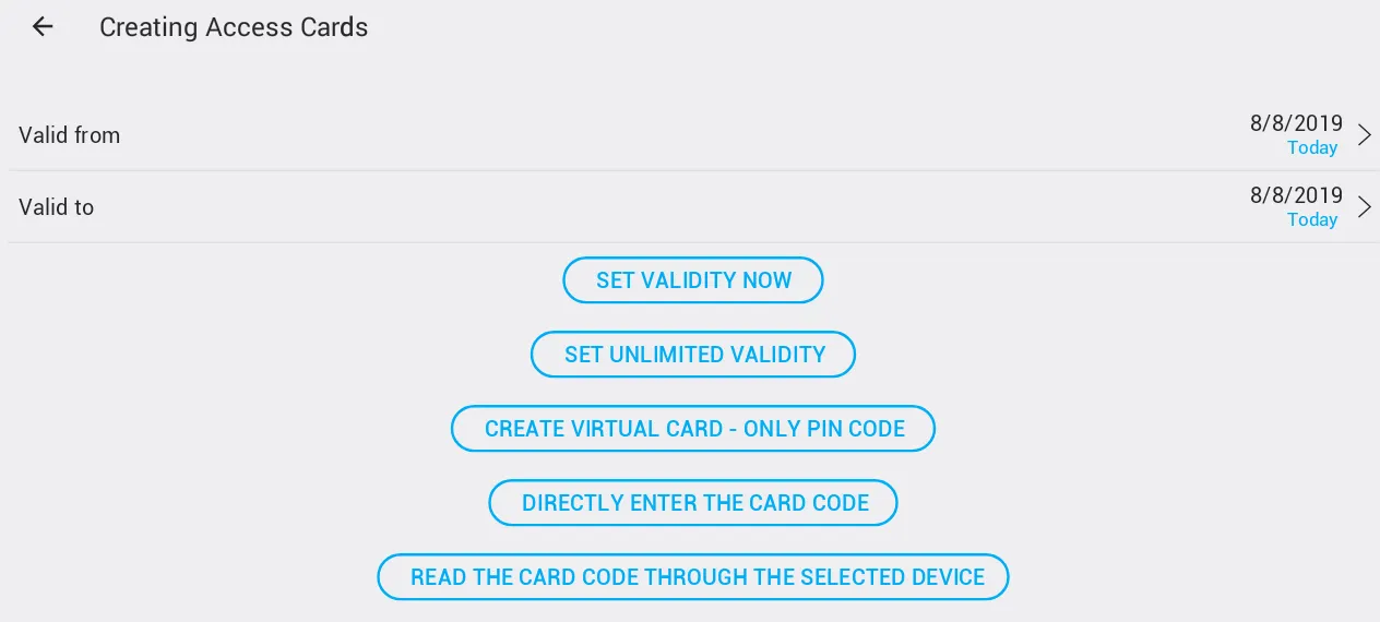 Bila Anda ingin mengedit waktu yang tepat untuk kartu yang sebelumnya telah menetapkan masa berlaku tanpa batas, akan lebih praktis jika Anda mengeklik terlebih dahulu SET VALIDITY NOW yang akan menetapkan tanggal aktual sebagai masa berlaku - kemudian Anda dapat memindahkan parameter "Valid hingga" ke tanggal yang Anda inginkan agar kartu tersebut berlaku.