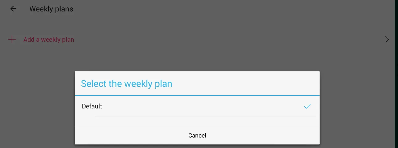 Pada halaman yang terbuka, pertama-tama klik Tambahkan rencana mingguan dan pilih dari rencana mingguan yang telah ditentukan. Rencana mingguan default ditentukan untuk memungkinkan akses pada tanggal dan waktu apa pun.
