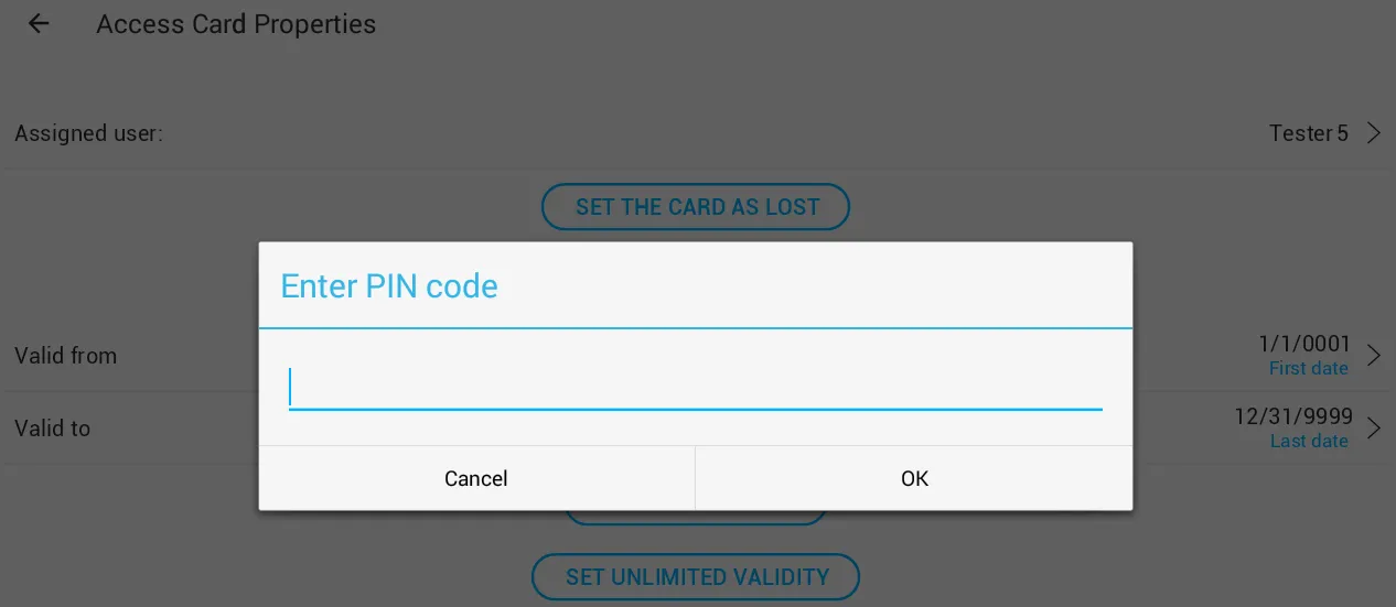 Ada kemungkinan untuk menentukan kode PIN untuk kartu. Ketika kode PIN ditentukan, akses dengan kartu hanya diberikan ketika kartu terpasang pada pembaca dan kemudian kode PIN dimasukkan. Memasukkan string kosong untuk kode PIN akan menghapus kode PIN dari kartu. Tidak diperbolehkan untuk menghapus kode PIN dari kartu virtual.