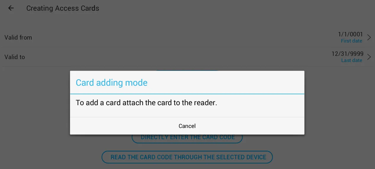 Ini adalah kasus yang paling disarankan. Setelah mengklik ini, dialog penambahan kartu akan terbuka. Memasang kartu ke pembaca yang belum ada di sistem akan menampilkan dialog konfirmasi.