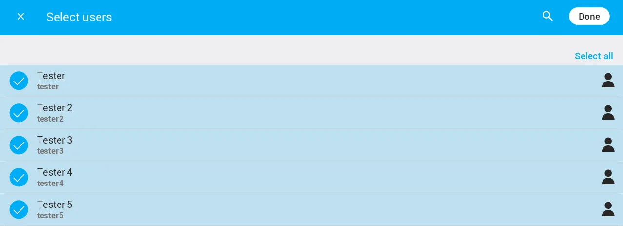 Dengan mengklik Tambahkan pengguna baru, dialog pemilihan pengguna akan terbuka, dan Anda dapat memilih satu atau lebih pengguna yang akan diaktifkan dengan paket mingguan konkret untuk mengakses melalui perangkat.