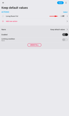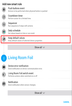 3. Akibatnya, output relay (misalnya, relay untuk Living Room Foil) akan dimatikan (OFF) melalui Smart Rule "Keep Default Value" yang memiliki prioritas lebih rendah.
