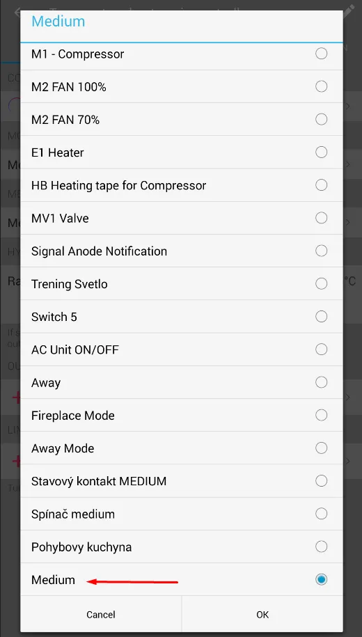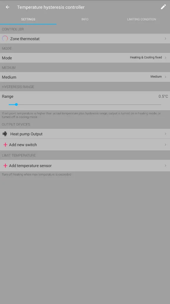 - Buat konfigurasi di mana relay TapHome yang mengelola jenis medium pada Pompa Panas akan mengalihkan sakelar virtual 'Sedang' secara otomatis dari Pendinginan ke Pemanasan dan sebaliknya. Ini akan menjaga sakelar 'Sedang' selalu dalam keadaan yang tepat (Pemanasan atau Pendinginan) sesuai dengan pompa panas.