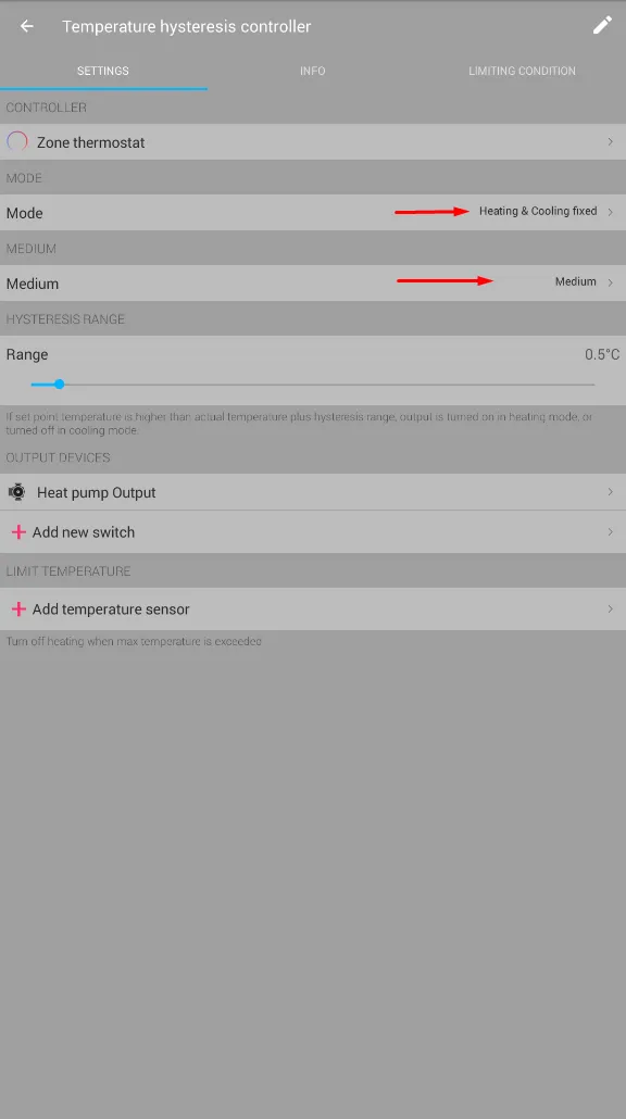 - Pergi ke Thermostat dan tambahkan 'Pengontrol histeresis suhu' Smart Rule. Dalam Smart Rule, gunakan mode tetap Pemanasan & Pendinginan dan sebagai Medium pilih sakelar 'Sedang' yang sudah disiapkan pada langkah sebelumnya.