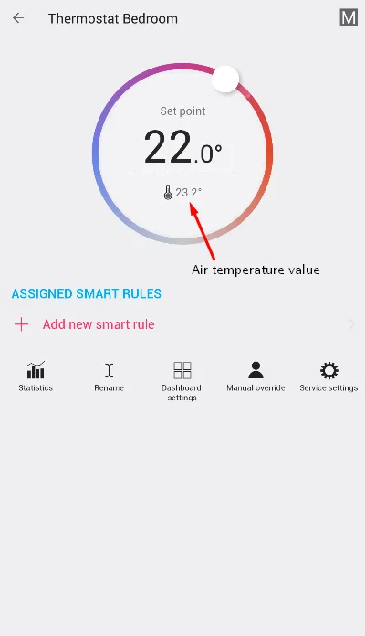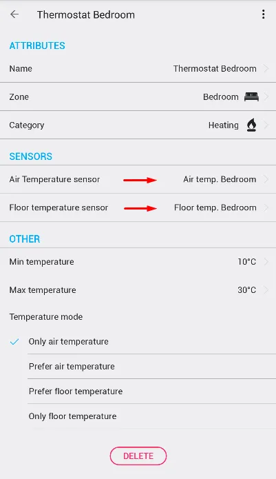 1. Buka pengaturan Layanan Termostat dan tentukan Sensor Udara (dan juga Sensor Lantai untuk pemanas lantai listrik) yang diaktifkan di Langkah 1.