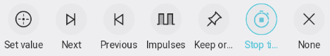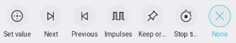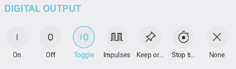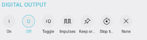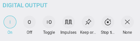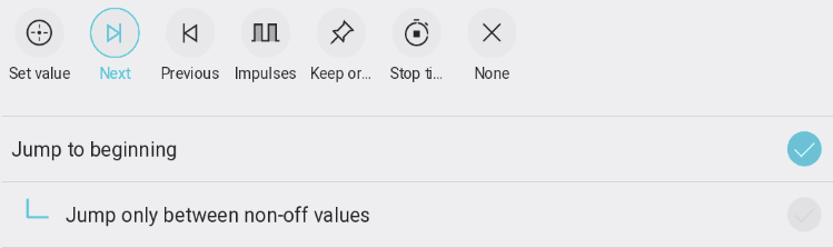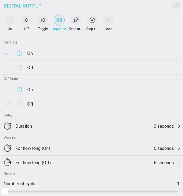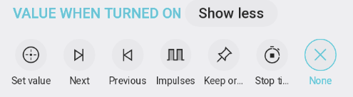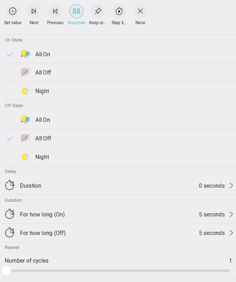 Pressing the push button performs combined action to switch between On state (last non-off state) and Off state (defined in Service settings, section Other) with option to define which is which, initial delay, duration for both states and number of cycles (repetitions).