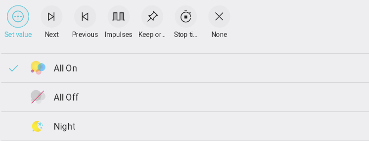 ℹ️This action affects On/Off states of Light Scene multivalue switch. On state is the last Non-off state value set manually or via Smart rule and Off state is defined as permanent in Service settings of Multivalue switch/Light Scene. This action affects On/Off states of Light Scene multivalue switch. On state is the last Non-off state value set manually or via Smart rule and Off state is defined as permanent in Service settings of Multivalue switch/Light Scene.
