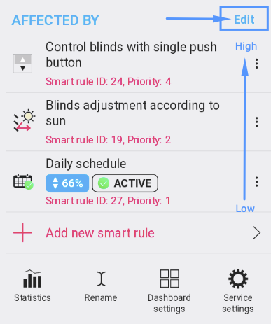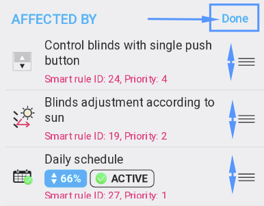 Daftar Smart Rules yang memengaruhi perangkat. Prioritas diterapkan dengan urutan top-down.