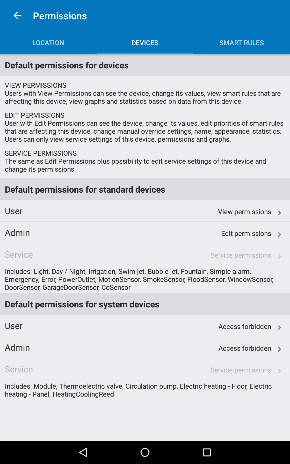 Untuk mempercepat proses konfigurasi, setiap jenis Smart Rule dan perangkat memiliki definisi izin default. Jika pengaturan ini diubah, maka perubahan akan secara otomatis diterapkan ke semua perangkat atau Smart Rules dari jenis yang sama, kecuali yang memiliki pengaturan izin khusus.
